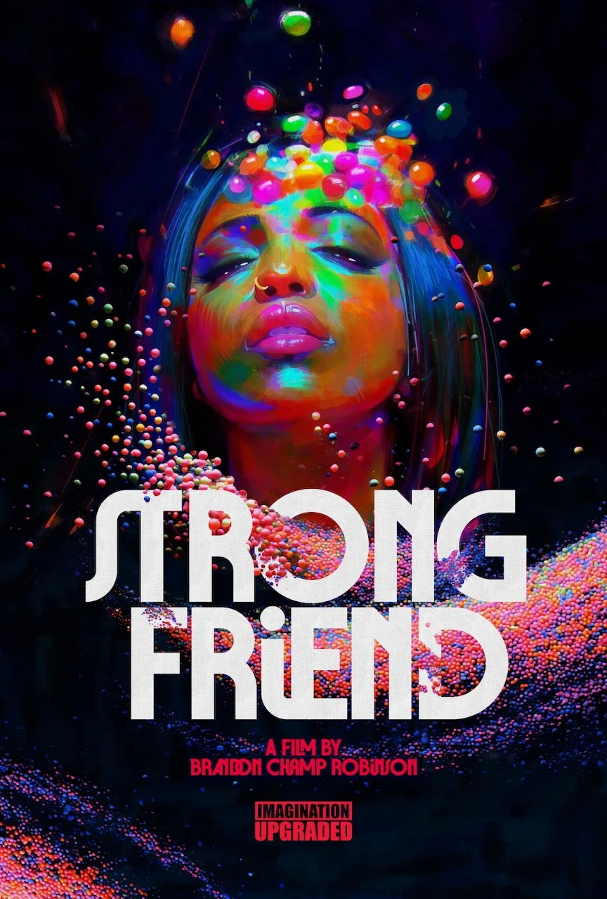 A bold, neon-colored portrait of a woman with her eyes closed as vibrant spheres float around her head. The film’s title “Strong Friend” appears in large, white letters across the bottom. Artwork for the short film directed by Brandon Champ Robinson.